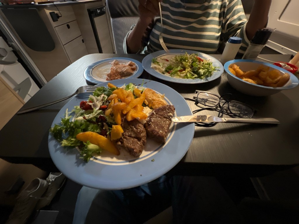 Op de camping wat lezen en drinken. Zo tegen 6en eten klaarmaken. C deed de sla en bakte aardappels. Ik deed het vlees en de vis buiten. Uiteindelijk met wat regen. Dus paraplu in één hand. Na het eten, afwas en wat lezen. Eens kijken hoe het morgen met Carcasonne, het weer en een overnachtingsplaats gaat.