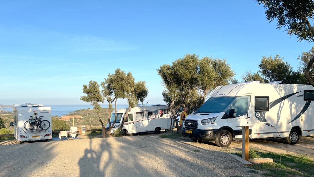 Zo gauw we in Cadaqués zijn moeten we 180° om en rijden naar boven. Na zo’n 1,5 km is de camping. Op een reserverings verzoek per e-mail was niet gereageerd.