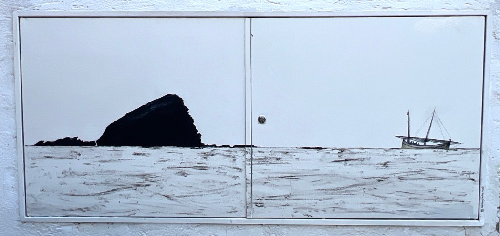 Rond 2 uur vertrokken we naar ‘beneden’ naar het stadje. Kochten brood voor morgen, bewonderden opnieuw het stadje. Het paneel bij het huis waar gas licht of water zit wordt vaak voor artistieke uitingen gebruikt.