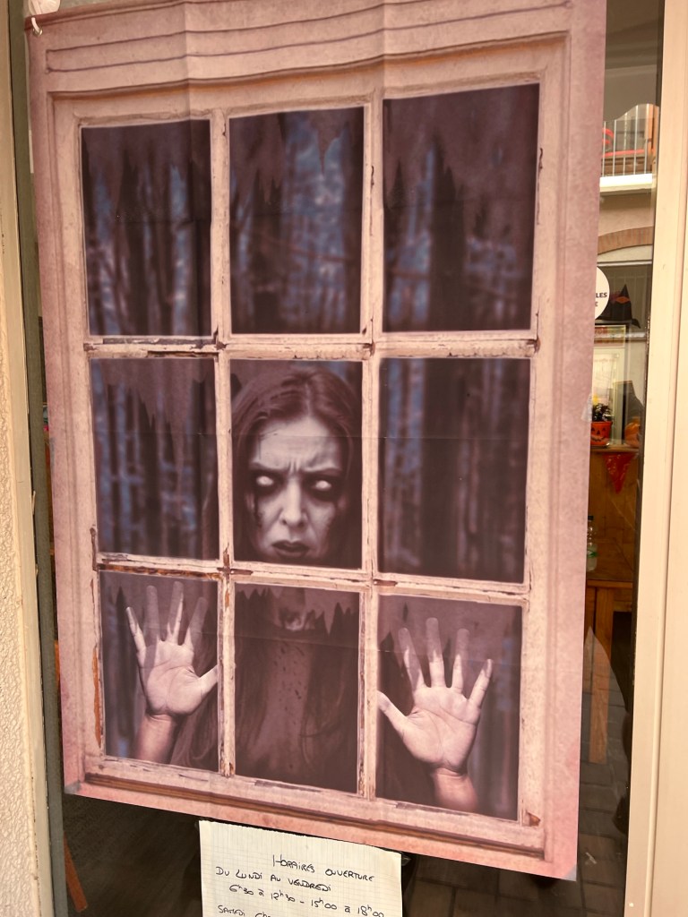 Uiteraard ook een kerk, maar het bijgeloof, Halloween, was in veel etalages te zien.