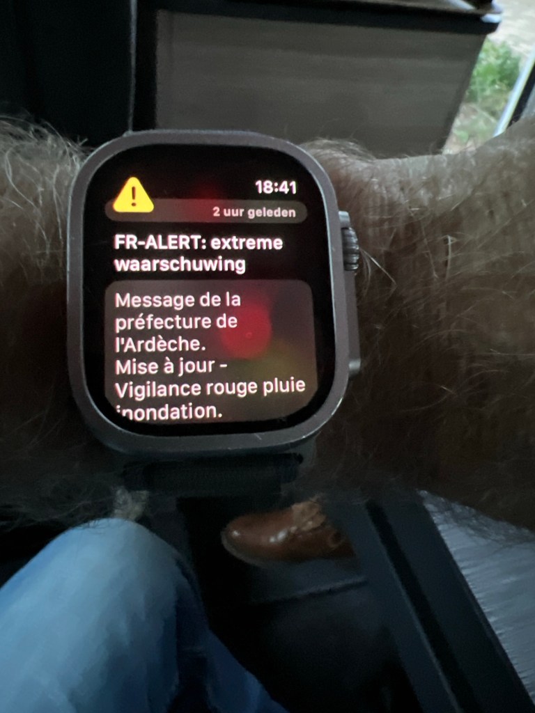 Lang verhaal kort, wel wat regen gehad, maar niet extreem. Na Valence waarschuwingen via SMS van de overheid, Ardèche code rood. Tegemoetkomend diverse konvooien met brandweer en reddingsvoertuigen.