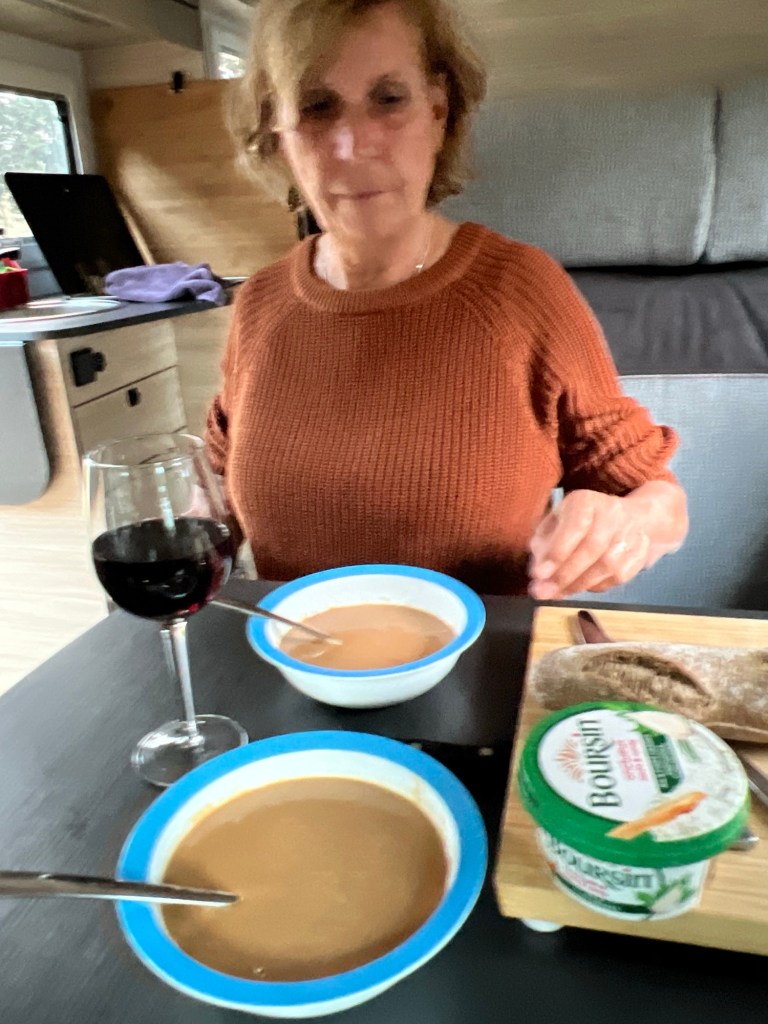 C zette weer een snel camping diner op tafel, pindasoep, stokbrood en smerende kazen. Met een rood wijntje.
