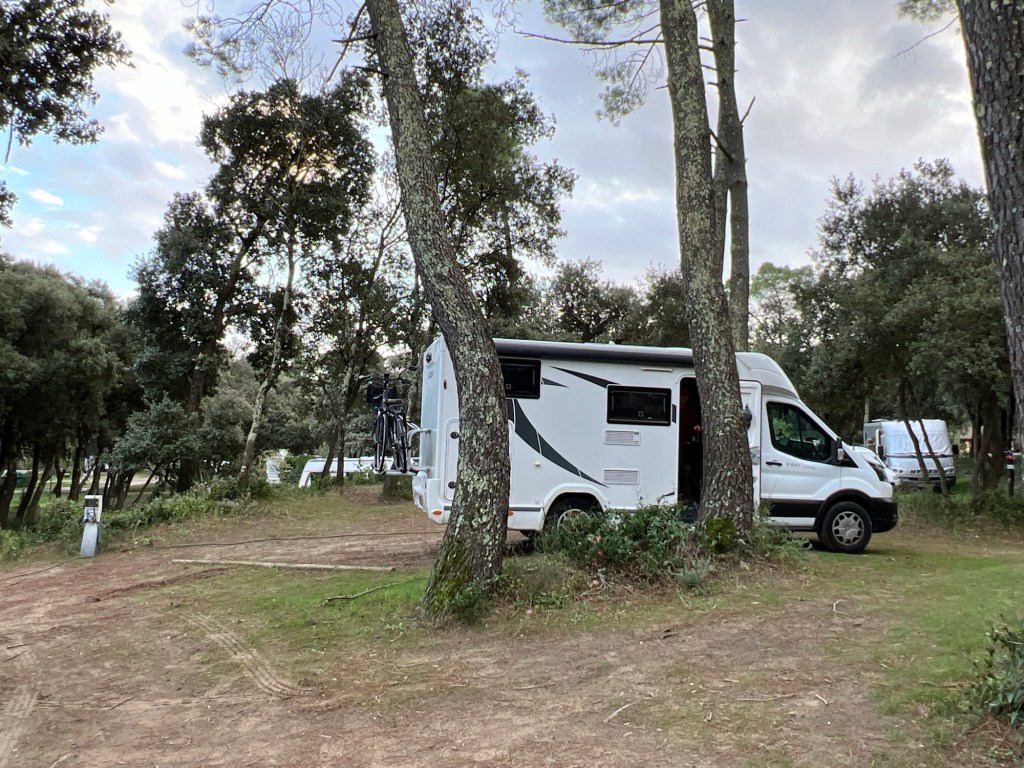 Mooie camping met plekjes, genummerd, schots en scheef in het bos. Prima, morgen zien we verder. Bij Argeles is de verwachtte temperatuur van 22° nu 18°. Maar zien hoe morgen de pet staat.