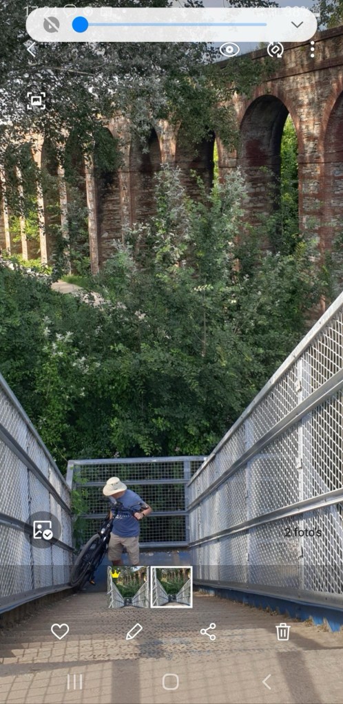 Grotendeels, want en het Aquaduct is niet meer in gebruik, en het wordt doorkruist door een snelweg. Daar is een stalen brug overheen gebouwd, maar niks om de fietser te helpen. Dus tillen die hap. Niet echt handig.