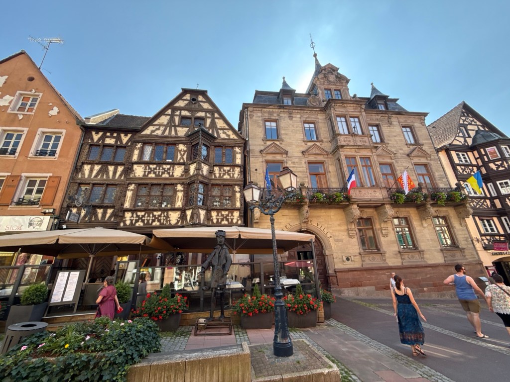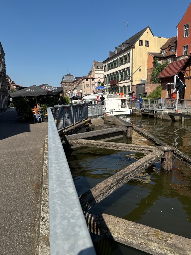 Na de camper op z’n plaats gezet te hebben liepen we naar het dorp. Oude Duitse vakwerkhuizen, jachthaven en kanaal met sluizen. Dit deel van de Elzas is sinds WO2 Frans, maar daarvoor van Duitsland geweest. De ouderen spreken Frans en Duits.