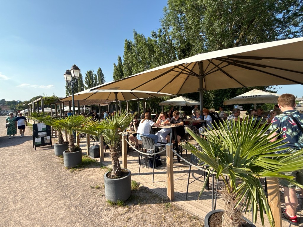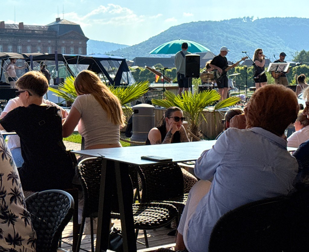 We horen de muziek, een koel briesje maakt het lekker hier.