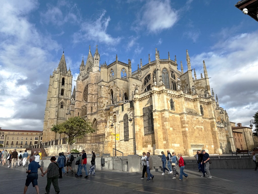 Dus douchen en ontbijten in de camper. Winkels gaan om 10 uur open, Aldi om 9 uur. We lopen naar de rotonde bij de camperplaats en zien één van de torens van de kathedraal. Dus nu de juiste weg, bijna rechtstreeks naar het centrum en de kathedraal. Scheelt wat meters.