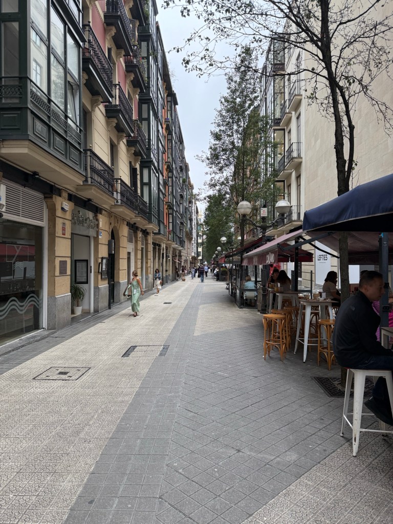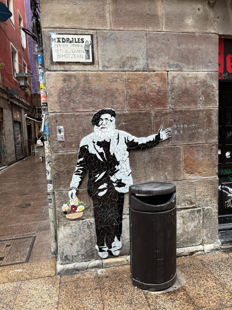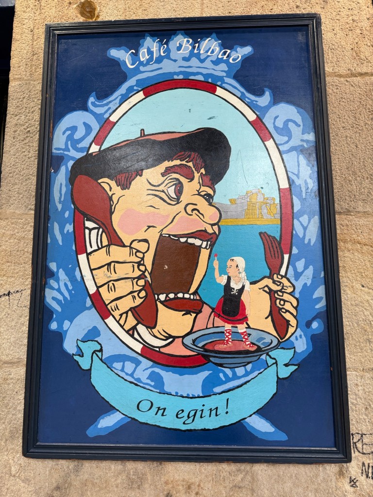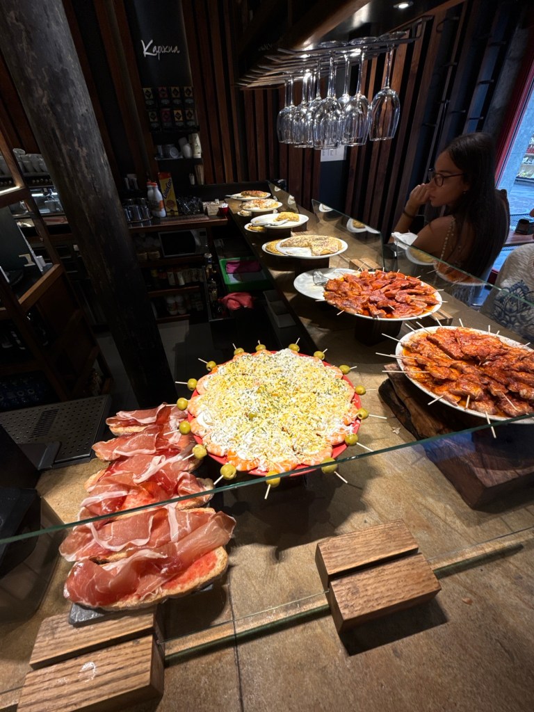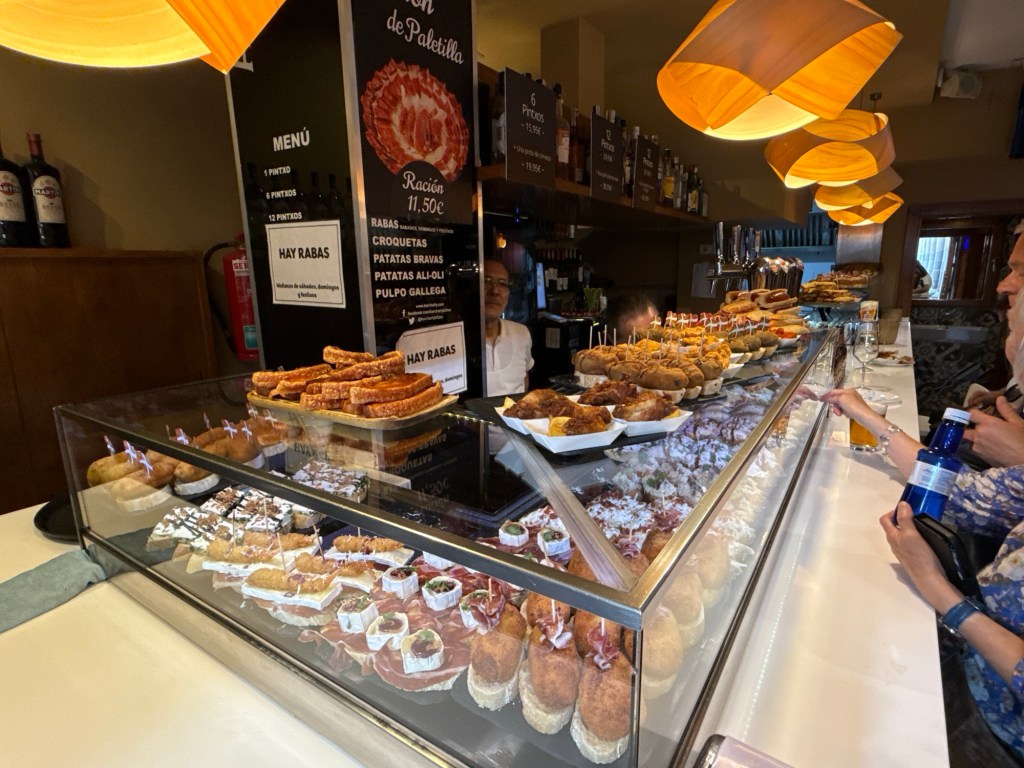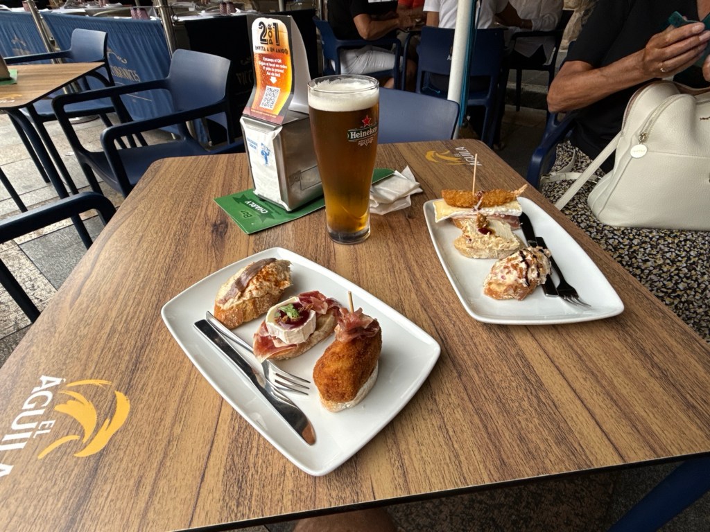 In het oude stadsdeel liepen we ook nog een tijdje rond. Uiteindelijk bij hetzelfde café pintxos genomen met een wit wijntje en een rode met prik, ijs en schijfje citroen. Deze omdat ze geen Sangria hadden.