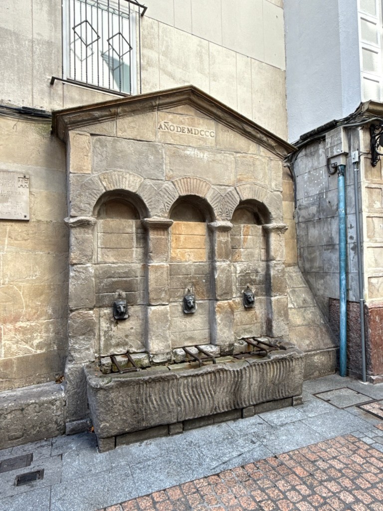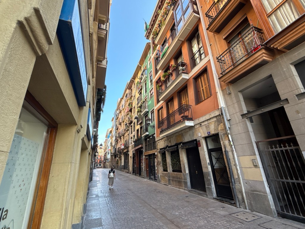 Een aantal straatjes liepen van de rivier naar de kathedraal d’Santiago. Ook diverse dwarsstraten. Winkels en horeca. Nu nog rustig.