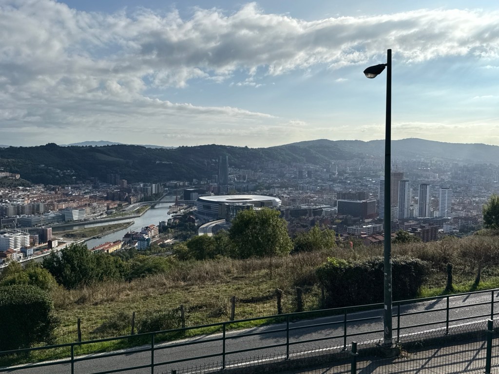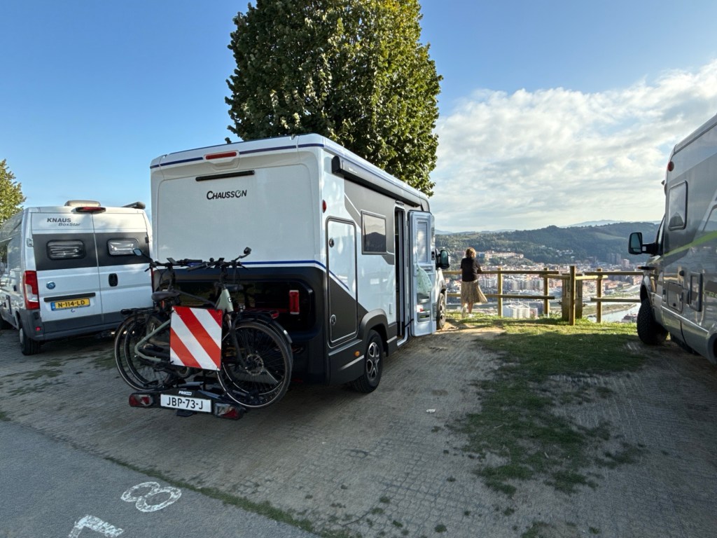 Snel douchen en ontbijten, snelle (oplos)koffie. Alles vast en zeker, langs de ontzorgingsplaats. Grijs en zwart water weg en voor de zekerheid drinkwater aanvullen. Half negen reden we van de camping af. Iets voor half 10 voor de deur bij de CP in Bilbao. De receptie viel mee. Ze was in haar eentje, mensen komen, mensen gaan, toilet sleutel wordt gehaald en weer terug. 2 toiletten voor 73 campers, maar de meesten hebben een eigen toilet. In een kwartiertje hadden we een plek.