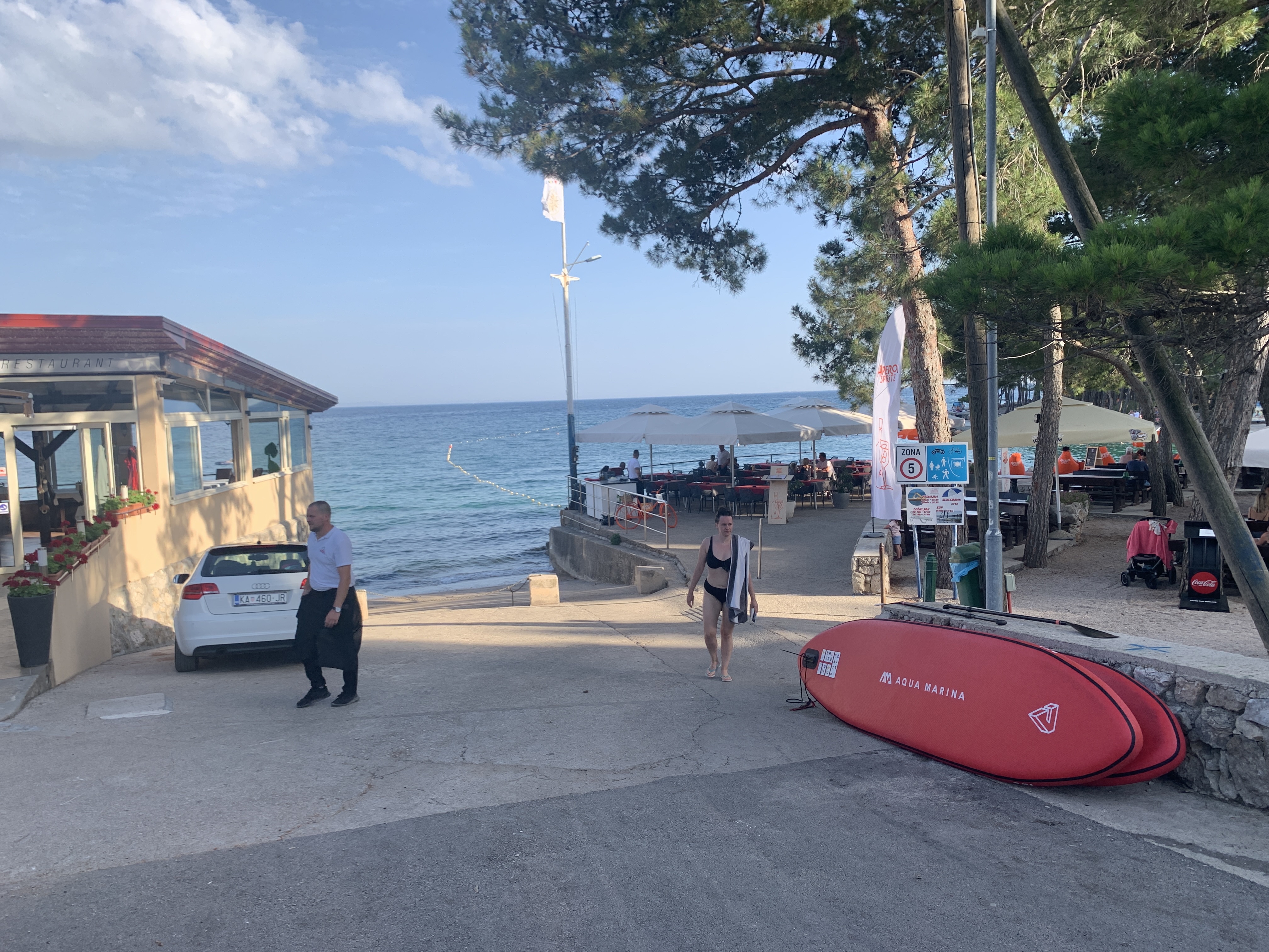 Half 4 waren we er, 600 meter van het strand, maar wel verticaal, er loopt een trap naar beneden, en dus naar boven, maar 6x de domtoren beklimmen, no way. Gelukkig dat we een huurauto hebben. Na alles gedumpt te hebben en eindelijk de lunch genoten te te hebben, vertrokken we met zwemkleding aan en handdoeken naar beneden, naar de parkeerplaats, 8 Kuna per uur, en naar het strand. Paar honderd meter breed, 10 meter diep, en dan zee, met wind en golven. Het was druk, gezellig, het water was koel en er waren vissen te zien…