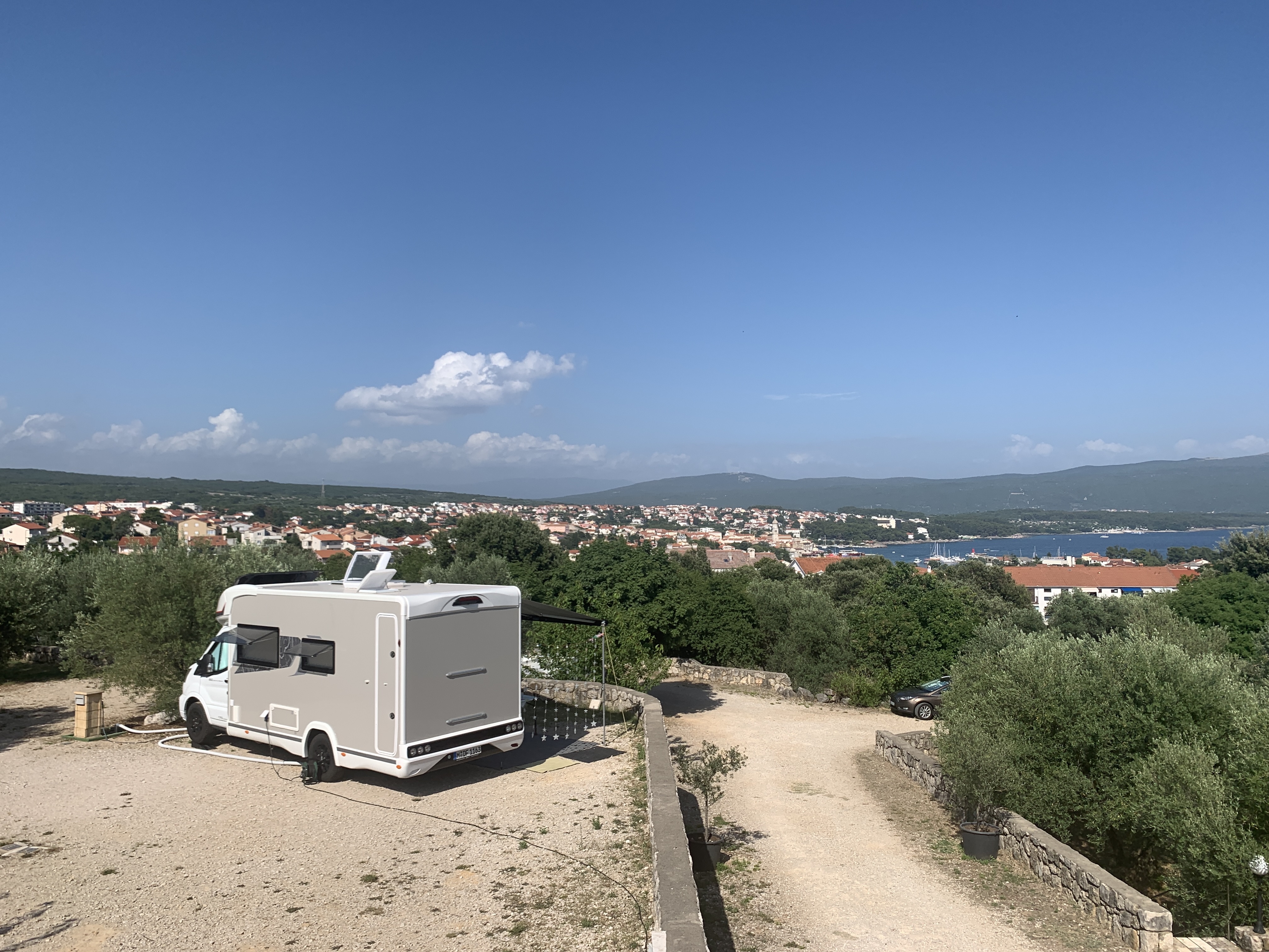 Dus, gezien de hitte, tijdje vooral niet veel gedaan. Aan einde van de middag even gekeken hoe ‘hoog’ we op de heuvel zitten. Best wel. Besloten later met de e-bike eerst naar het strand te gaan kijken, hoe, waar, hoe ver, en dan door naar de oude stad van Krk.