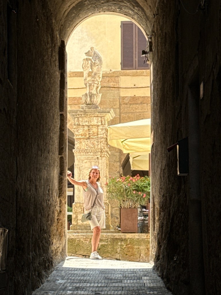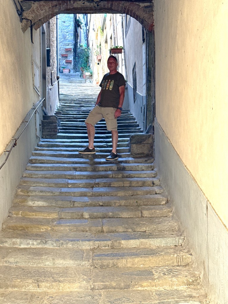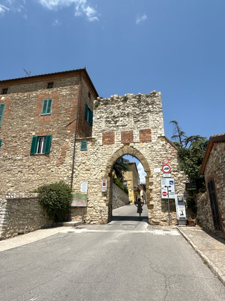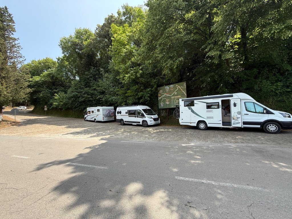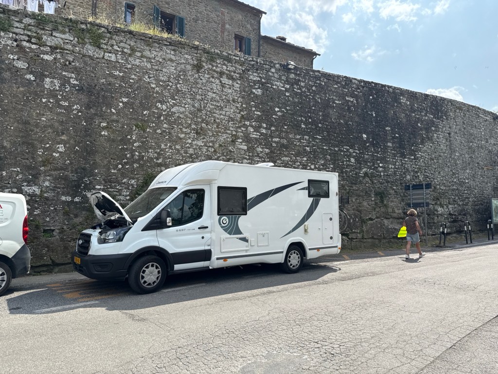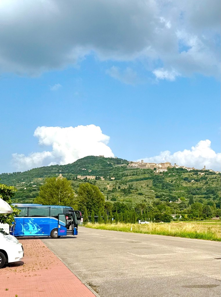 Zo tegen 12 waren we bij een P voor campers bij Montepulciano. Het was even zoeken waar te betalen. Het goedkoopste was €5 voor 6 uur. Vrolijk huppelden we naar boven naar de stad.
