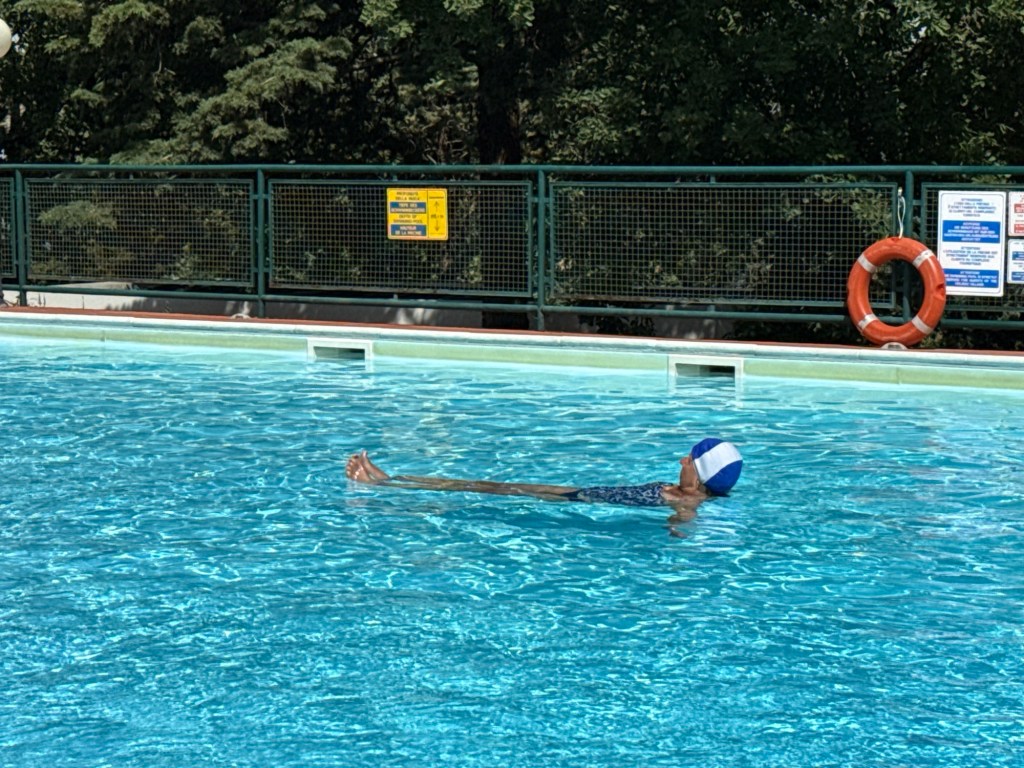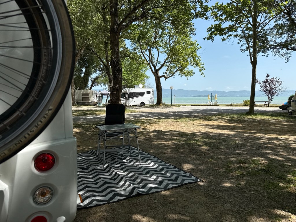 Na de camper geplaatst en aangesloten te hebben ging C zwemmen. Later ging ik daar even kijken en deelden we een ijsje.