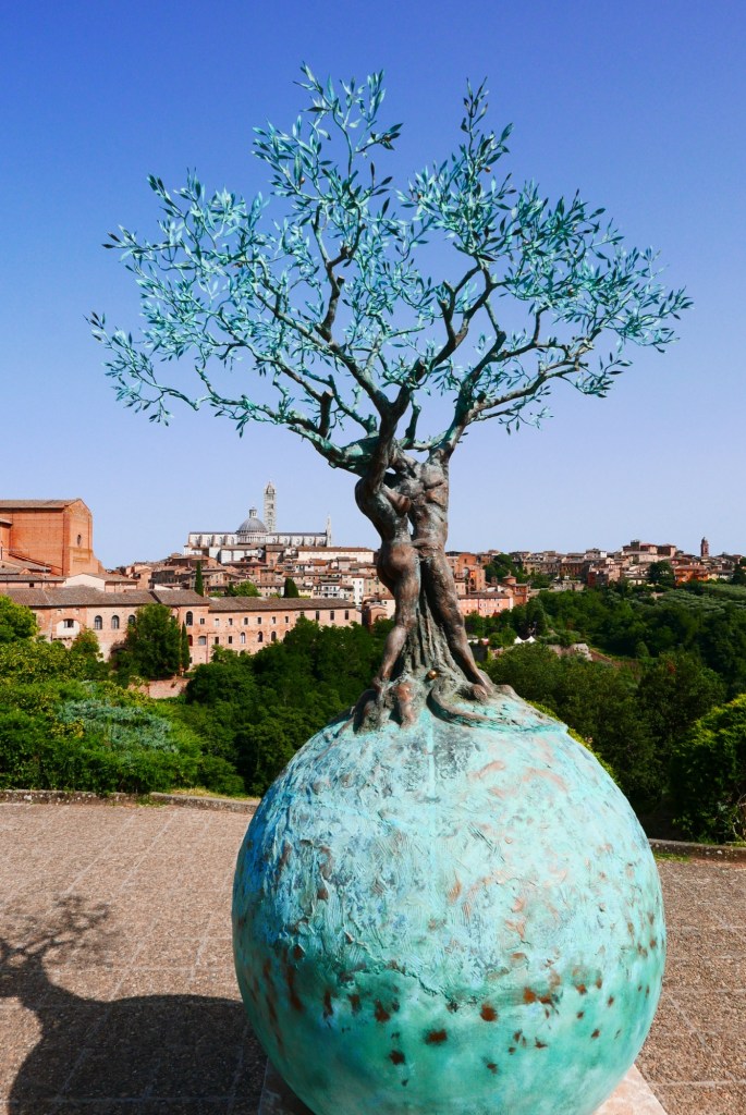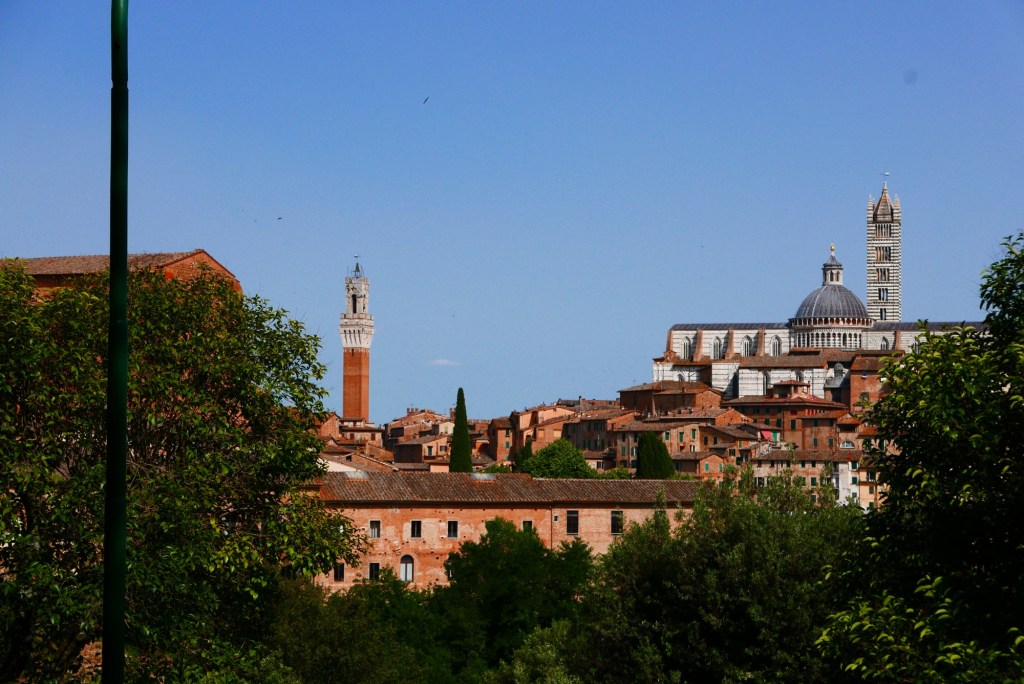 Zo rond 4 uur liepen we naar boven. Zowel Siena (7) als de camping liggen op een ‘berg’. Buskaartjes gekocht bij de receptie en even later in bus 3 naar de stad. Was even de oriëntatie kwijt. Zowel bus 3 als 8 gaan naar een busterminal tegen de oude stad aan. Maar ik zag hem niet. Te vroeg of te laat stapten we uit de bus toen we de achterkant van de Duomo zagen. Met Maps.Me bleek dat we minder dan een km van de oude stad zaten.