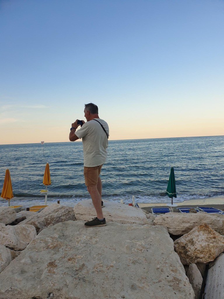 Na het vaatje liepen we nog een uurtje langs het strand. Door de heuvels in het ‘midden’ van de laars, gaat de zon hier wat eerder onder (achter de heuvels dus).
