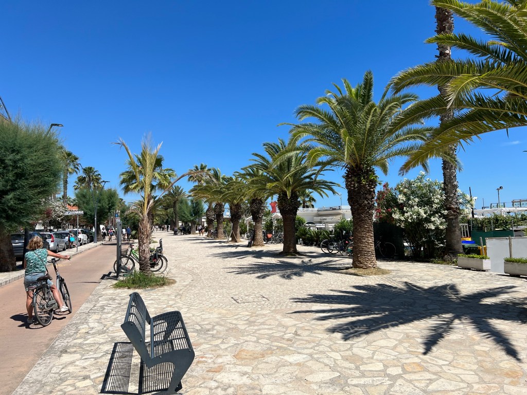 Zo, het ‘volledige’ verslag van dag 11. We wilden naar Grottammare (18), die stond nog op de lijst van Le Marche. Over de snelweg reden we er langs, op weg naar Martinsicuro. Het blijkt op de fiets zo’n 21 km te zijn. En voornamelijk een recht fietspad langs de kust. Dat klopte aardig, alleen in San Benedetto moesten we een stukje door de stad. Het fietspad was aardig te volgen. 2 baans, heen en weer. Vaak gedeeld met voetgangers. Apart gekleurd wegdek. We rijden meestal, heen met rechts de stranden en strandtenten. Links eenbaans (eenrichtingsweg) voor het overige verkeer en dan hotels en parkeerplaatsen. Dus bijna 21 km strand etc. Apart. Extreem druk was het niet.