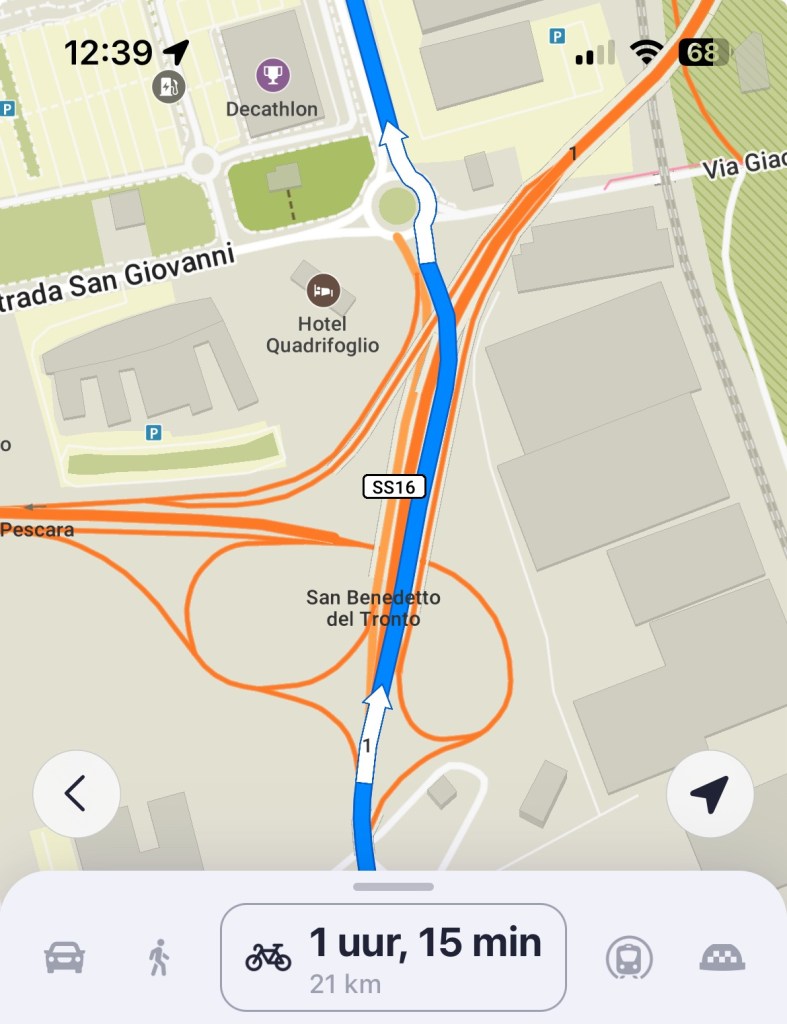Op de fiets, met rijwindje, was het prima uit te houden. Na een dik uur waren we in Grottammare. Onderweg één heikel punt, waar we de juiste baan moesten vinden, tussen veel autoverkeer bij een plek waar ook aansluiting met de snelweg is. Met een ander stel op de fiets en aanwijzingen van enkele automobilisten lukte dat.