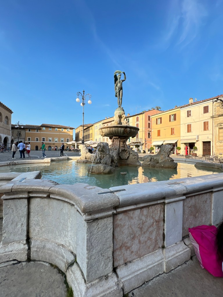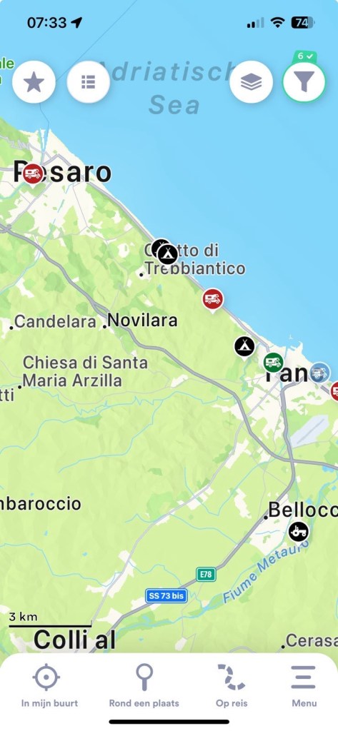 Het was een beetje uitgestorven. Dat hebben we eigenlijk bij al deze plaatsjes wel. Overnachten hier, ondanks de gratis plaats, word hem niet. We kijken naar Frasassi, met de grotten (8 en 9). Maar dat trekt ook niet zo. En Fabriano (13), die maar proberen.