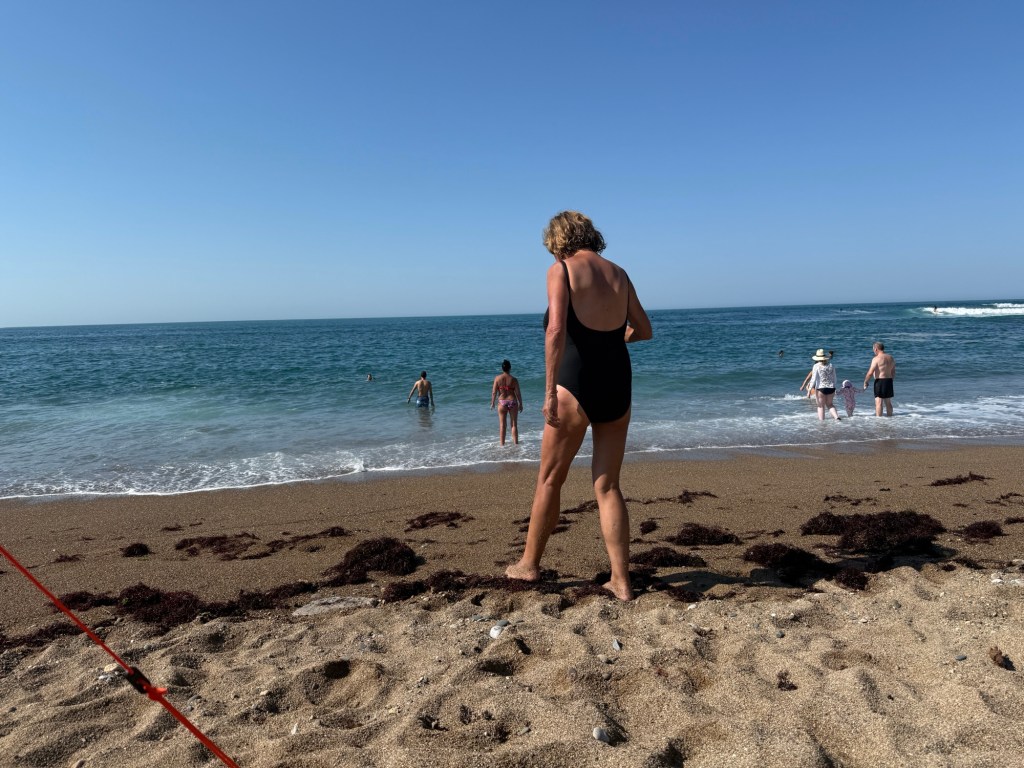 Koffie, cappuccino, tot €5 voor een soepkom. Café au lait is niet ieders smaak. Het werd tijd om terug te rijden. Lunchen bij de camping en nog even een uurtje aan zee zitten. C hield het droog. Ik ging er nog even in, zelfs met masker. Helaas troebel water door zand en grind. En uit zee komen, met die rollende golven, was vooral lachwekkend voor de kijkers.