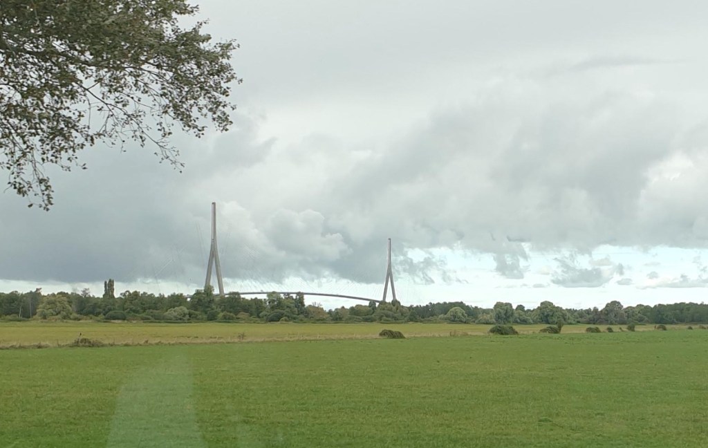 Na een rondje liepen we nog even langs de Lidl, sla, koekjes, chips en blok kaas. Bij de camper begonnen we de laatste zaken te regelen, toilet was vol. Kwart voor 12 naar de grijs water en water laden plek. Kaartje kopen om weg te kunnen (1 nacht) en hup op weg, eerst via de Pont de Normandië. Nog tol, daarna TomTom omzetten voor vervolg zonder tolweg.