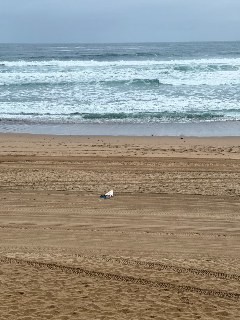 Ook hier een mooi strand, dik 1000 m langEn zoals overal flinke (surf) golven. Toch wel eng, 2 paar schoenen, handdoeken, niemand te zien.