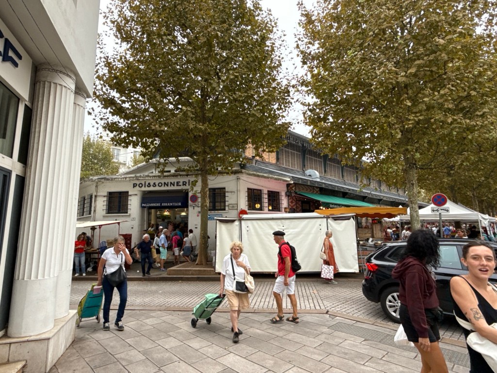 Daarna klaar maken voor fietsen naar centrum Saint Jean de Luz. Met Maps.Me was dat een eitje. Bij het marktgebouw is vandaag, buiten, weekmarkt. De markt in de markthal is dagenlijks.
