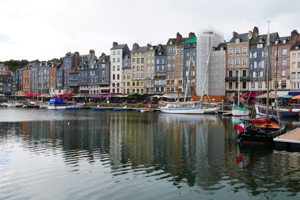 Aankomst Honfleur, eerst zagen we de brug van Le havre, immens ding. Dat zie je vooral als je er zelf over rijdt (morgen).