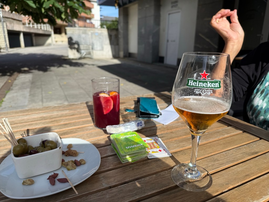 In het oude stadsdeel liepen we ook nog een tijdje rond. Uiteindelijk bij hetzelfde café pintxos genomen met een wit wijntje en een rode met prik, ijs en schijfje citroen. Deze omdat ze geen Sangria hadden.