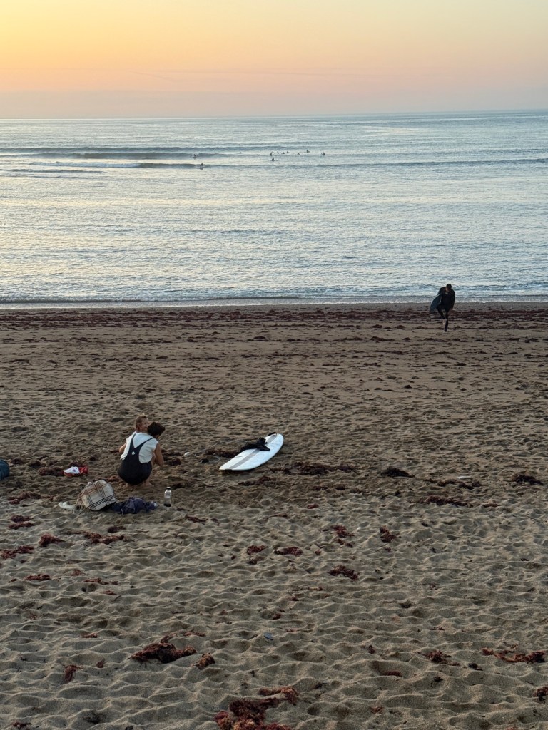 We liepen nog een keer naar het strand, zon was onder en de laatste surfers bereden de golven.