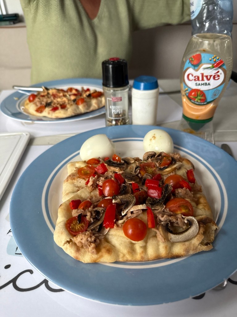 Daarna maakte C de pinsas af met o.a. tonijn, tomaat, paprika, knoflook, champignons en gekookt ei voor mij.