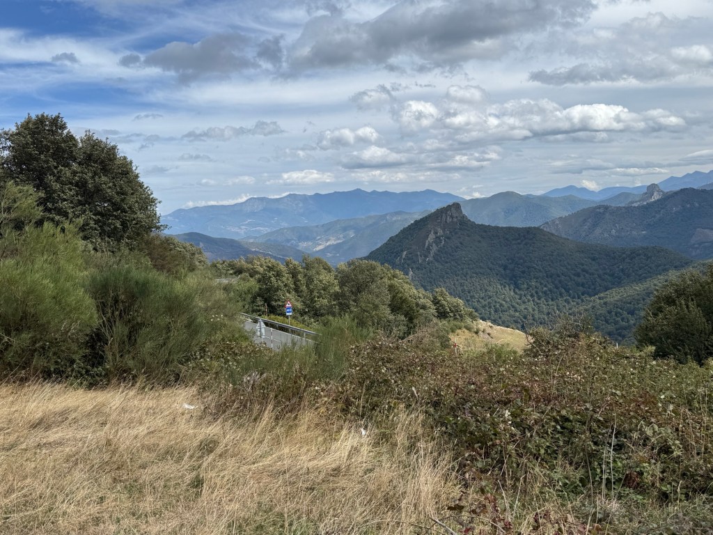 Dit is een mooie weg, vergelijkbaar met de N621 en N625. Het weer, eerder soms zonnig, was wat grauw. Het leek dat we weer over een pas (1379 m) gingen. Bijna boven in de wolken, mistig en regen. Naar beneden 17%, 14%, 13%, kon niet op en je zag bijna niks.