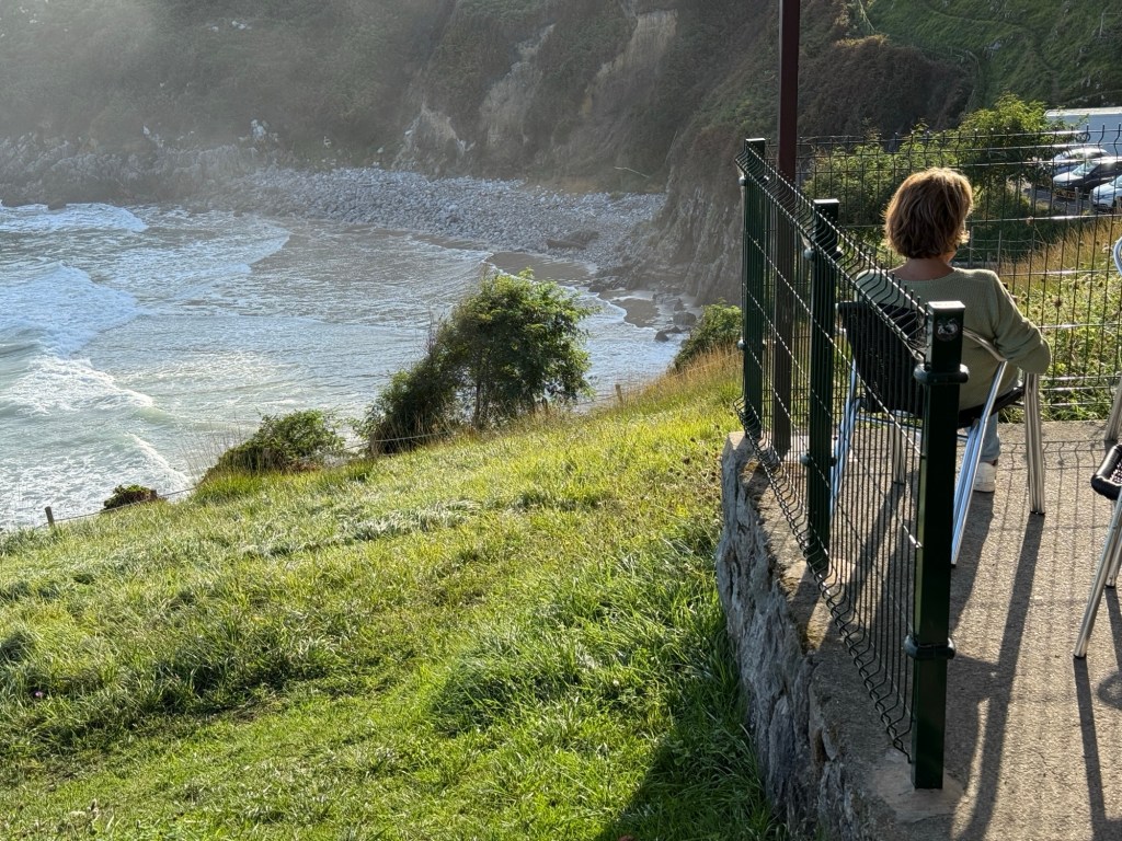 Douchen en ontbijten. We hoeven niet naar beneden om brood bij de receptie te halen. Brood van Pendueles was nog niet op. Voor 12en konden we niet aankomen, dus nog even tijd om van de zon, hier, en van het uitzicht te genieten. Met een koffie.