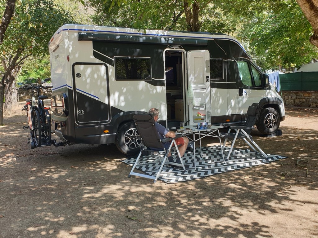 C zwom diverse baantjes, ik hield het bij 2. Daarna lezen in de ‘strandstoelen’. De zon brandde aardig en er was niet genoeg schaduw van de parasols. Dus terug bij de camper, die lekker in de schaduw staat.