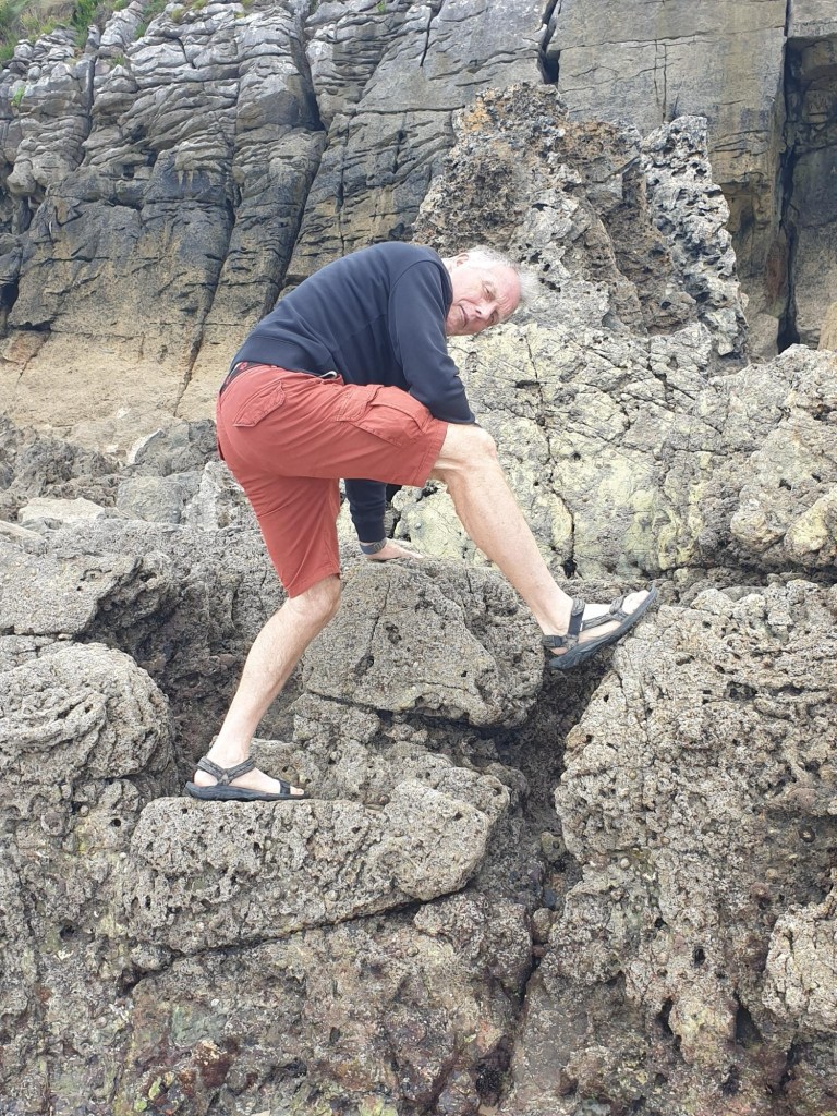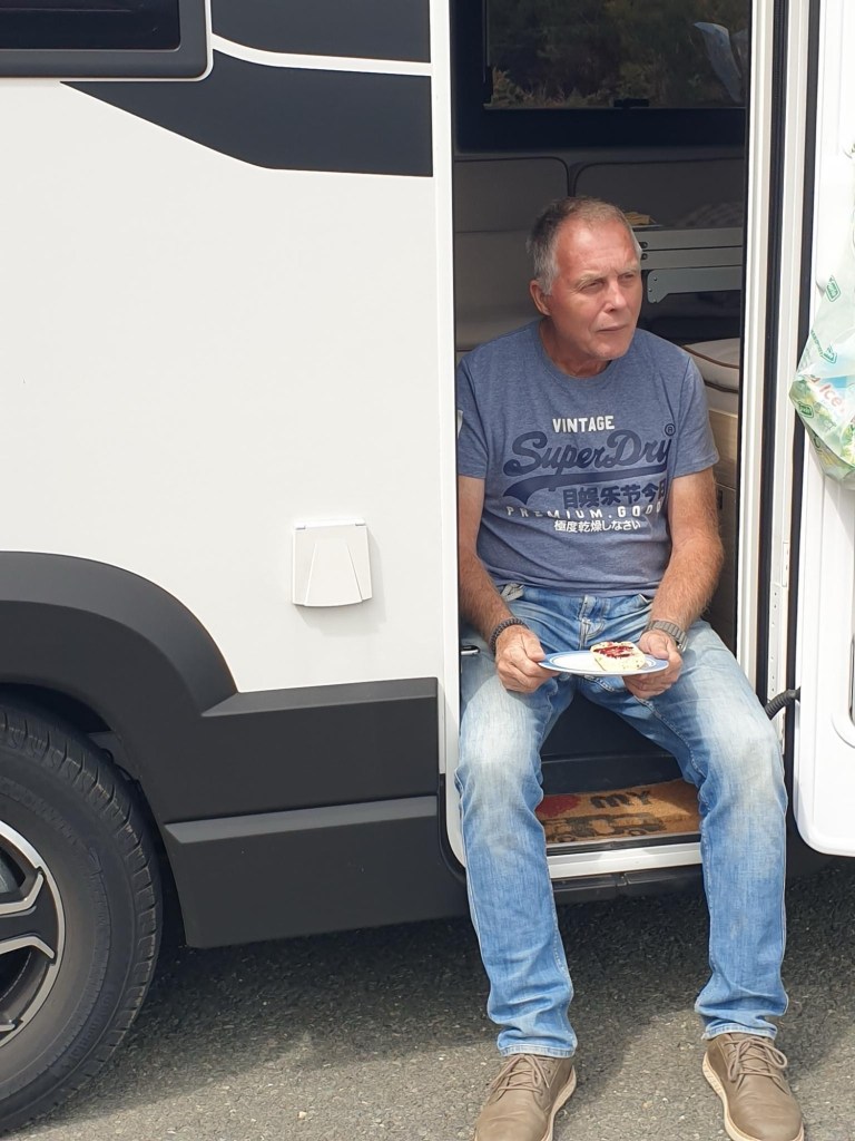 Koffie van gemalen koffiebonen en daarna douchen. In de doucheruimte aanwijzingen “druk de knop in voor warm water“. Doucheknop geeft alleen koud water. Geen tweede knop, bij andere douches gekeken, geen tweede knop. Wel mannen die zich ongedoucht weer aan het aankleden waren. Komt er iemand van de camping binnen, knop indrukken voor warm water??? Blijkt de ‘lichtknop’ in de douches, de tweede knop te zijn. Dus iedereen kleedde zich weer uit. Heerlijk warm water.
