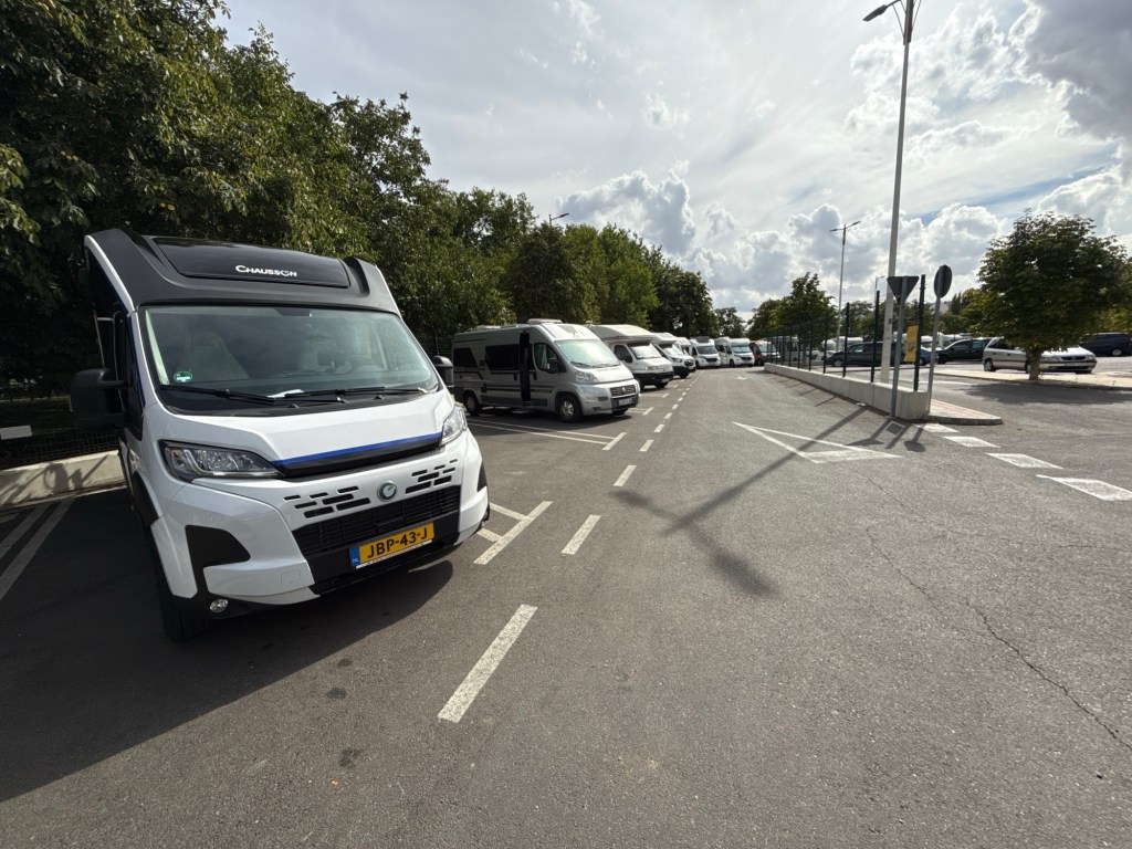 De auto achter hield ruime afstand. Maar aan alles komt een einde, na een flinke daling waren we uit de wolken en de regen. We moesten aan de noordkant zijn. De weg leidde ons een nieuwbouw wijk in. Parkeerterrein met 2 stroken gratis voor campers. De rest betaald parkeren.