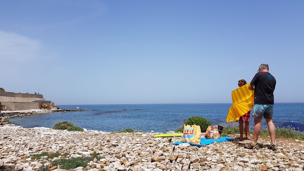 Terug op de camping, nadat de inkopen in de koelkast verdwenen waren besloten we om nog een uurtje of zo in zee te gaan. Net voor de ingang van de camping ligt een stukje strand, zandstrand, en dat zag er heerlijk uit. Ja, het was zelfs heerlijk. Iets minder verfrissend (lees koud) dan de eerdere pogingen deze week. Zeer aangenaam zelfs.