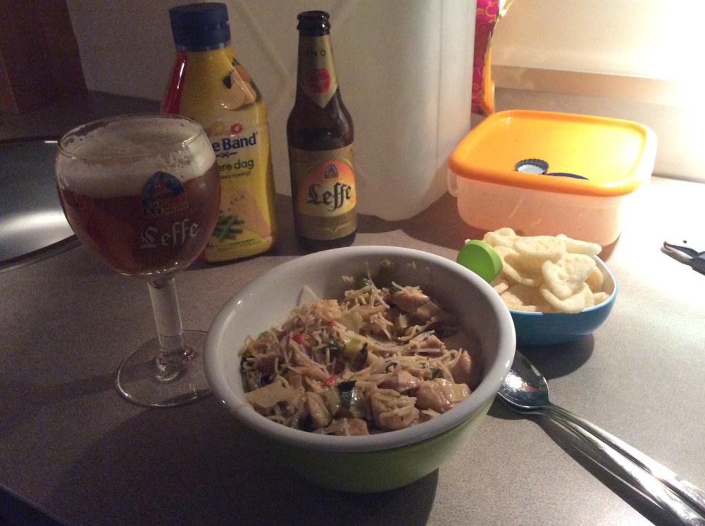 Op de camping aangekomen begon ik met de Kip Tandoori. Eerder vandaag was ik tegen een paprika aangelopen, dus alles was nu aanwezig. Tezamen met een Colombo, Corsicaans witbiertje (fles met kurk, 0,75 L), ging dat er prima in. Morgen en overmorgen dus ook Kip Tandoori. Na de afwas was het tijd voor dit blog.