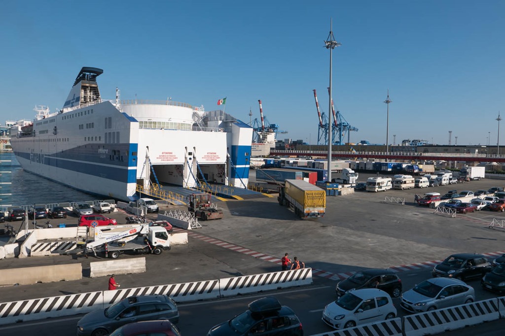 Om 3 uur vertrok ik voor nog eens een 175 km, naar de ferry haven van Genua. Het was best rustig op de weg. 2/3 is een rechte weg, 1/3 is door de ‘bergen’, bochtig, smal en kicken, met een caravan achter je. Genoeg vrachtwagens om in te halen. Nicki Lauda zou er z’n handen niet voor omdraaien. Beneden aangekomen was het rechtsaf en binnen 5 minuten ben je dan bij de ferry haven.