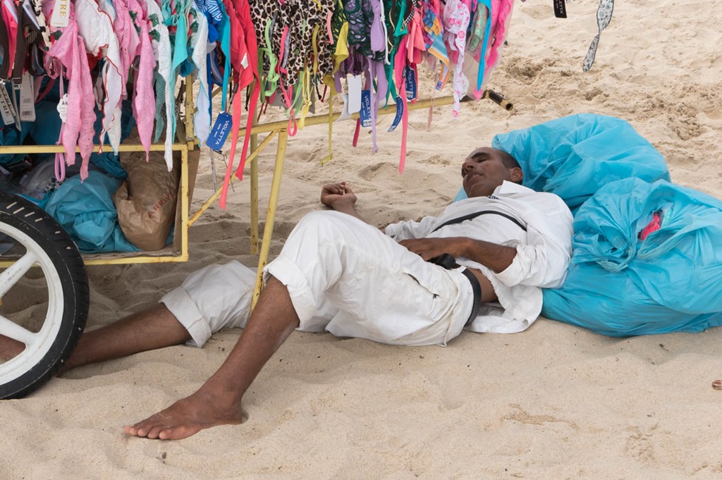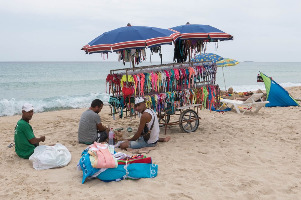 Ook hier veel strandverkopers, van ijsventers tot verkopers van die gekleurde strandlakens. En, wat ik nog niet eerder gezien had, hier ook divers verkopers met karren vol met bikini’s. Alsof je op het strand komt en denkt hé wat ben ik nu vergeten, en eens even uitgebreid passen. Er zal wel een markt voor zijn, anders sta je daar maar voor joker, met zo’n kar.