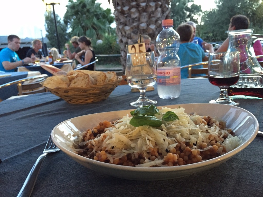 De keuze viel op een Griletto met Rucalo en kaas. Met Patatino Fritte. Waarbij je dus denkt dat je frieten krijgt. Niet dus, de laatste verrassing voor van vandaag. De Patatino Fritte bleek een groot bord met verse chips te zijn. Tja…. wie bedenkt het. Afgeblust met een rood wijntje en acqua ging het er allemaal goed in. Als toetje, iets echt sardeens, een sabadas, deeggebakje overgoten met honing en cappuccino.