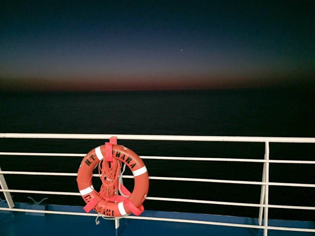 Ik werd weer veel te vroeg wakker. Half 5, het schip voer rustig zijn gangetje en de hoofdmotor deed ritmisch zijn werk. Nadat verder slapen geen optie leek ben ik maar één dek hoger aan dek gegaan. Ik was niet de enige… Aan stuurboord was in de verte wel wat land of lichten te zien. Aan bakboord begon het in het oosten te dagen. Dat was wel een foto waard. Ik had m’n foon bij me,